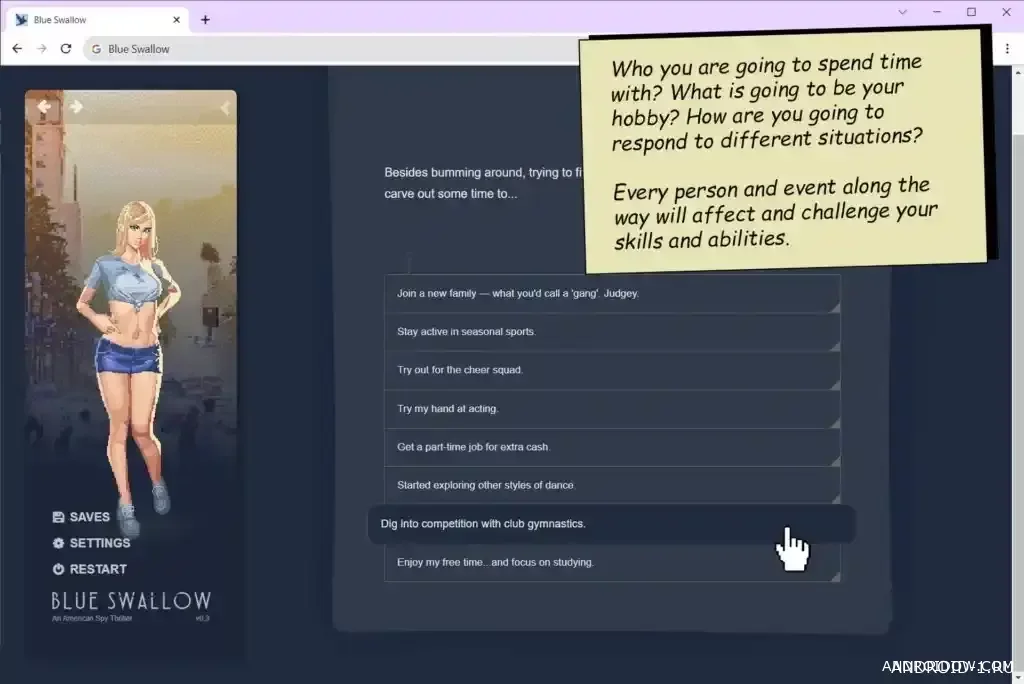 Blue Swallow (18+) is a browser—based visual novel with an extensive plot in which you take control of Claire, an ordinary girl unexpectedly drawn into the world of covert operations. Her life changes dramatically after being recruited into a dangerous undercover mission, where any mistake can have serious consequences.