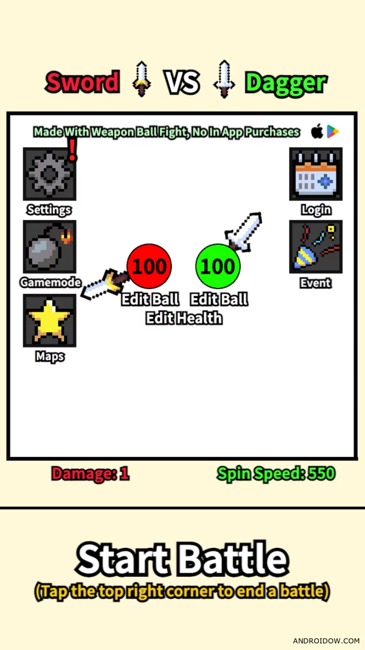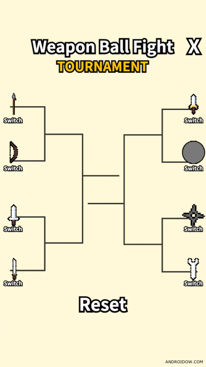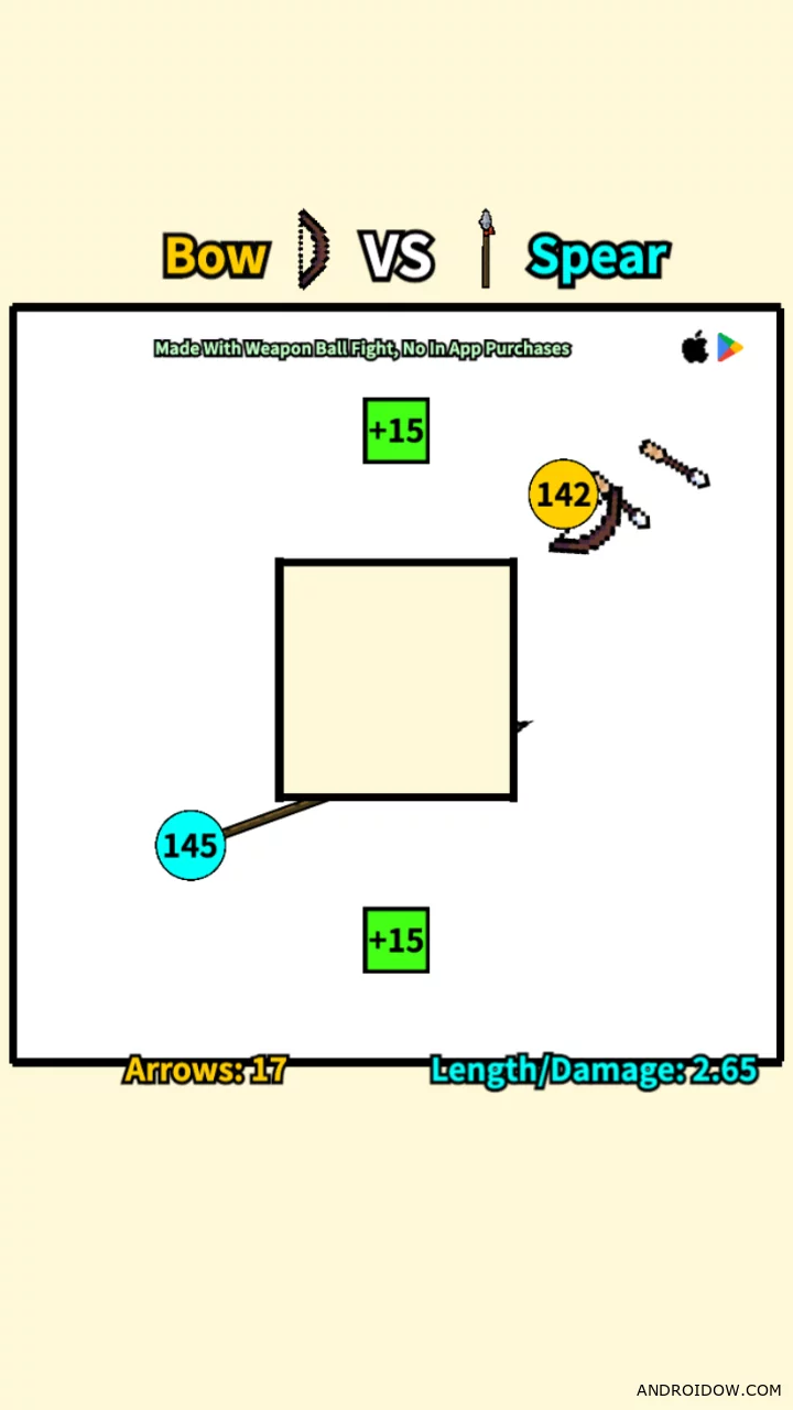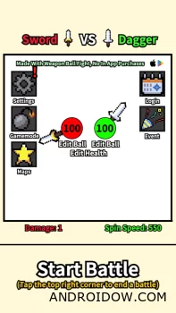 A weapon is selected at the beginning of the game. The arsenal is huge: swords, bows, spears, shields, magic staffs and even explosives. After the selection, the battle begins — the balls rotate, collide with walls and cause damage to opponents, enhancing their characteristics. Each hit affects the character's parameters — speed, impact force, and trajectory. There is also a video recording feature to share the best moments with friends.