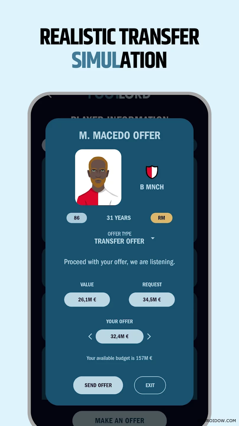 FootLord - Football Manager is perfectly adapted to touch control. Simple navigation and stylish interface make the game convenient even for beginners. This is your chance to feel like a real football genius and prove that you are capable of leading the club to the heights of glory.