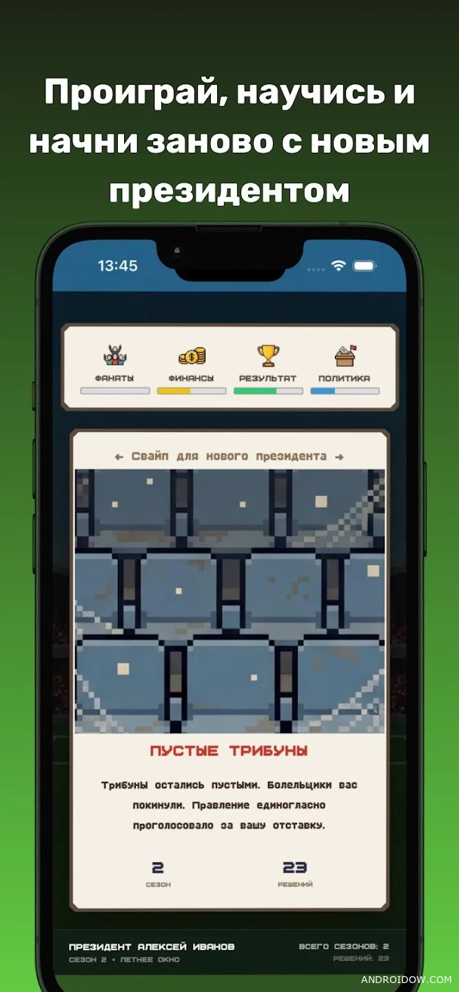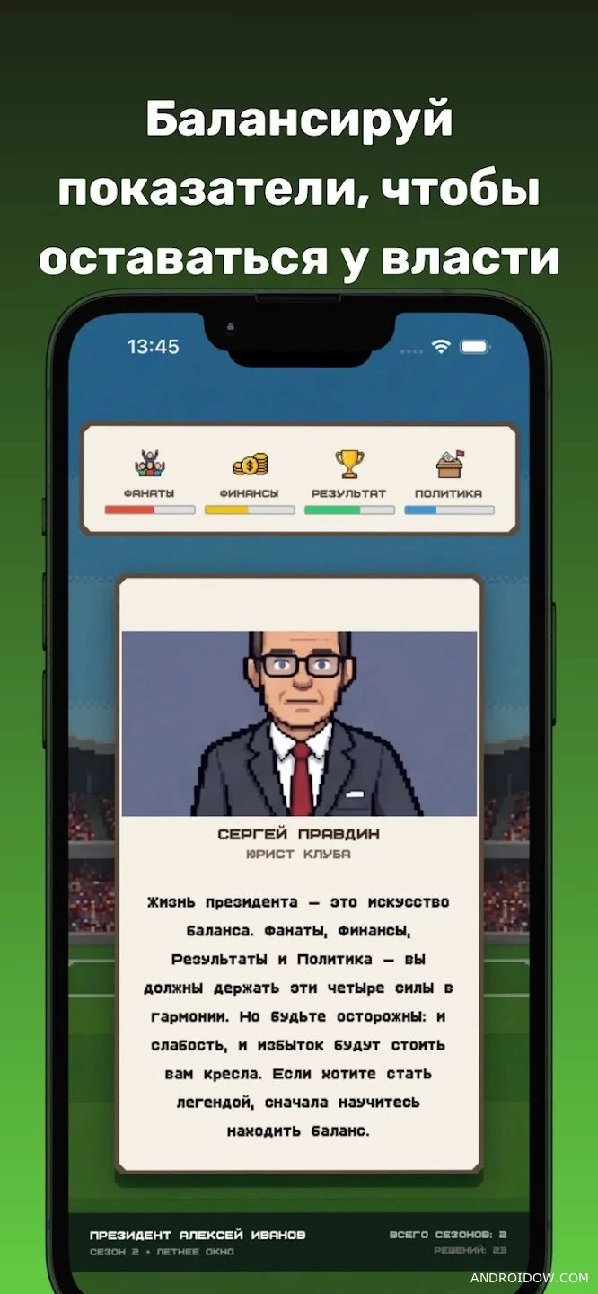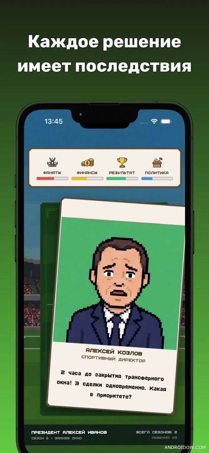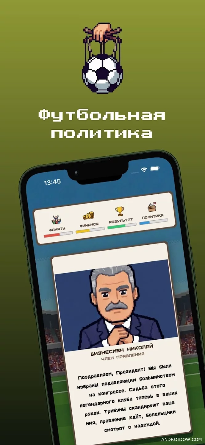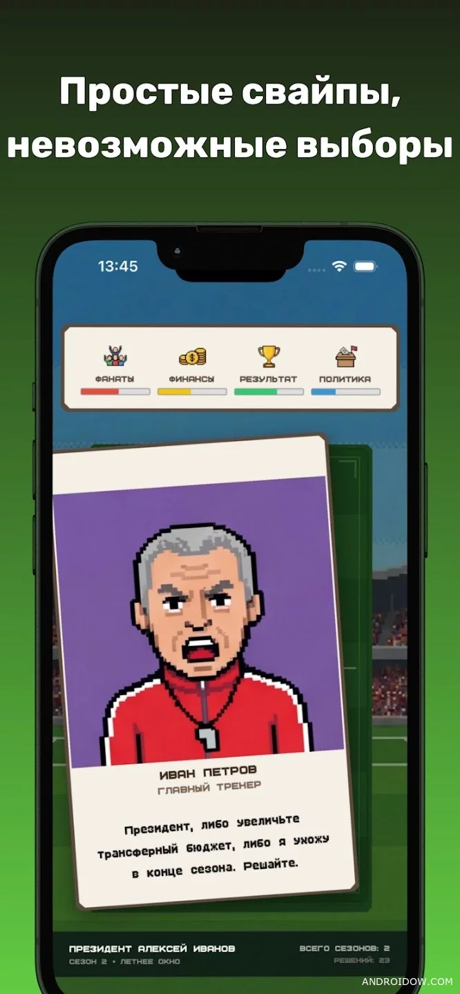 Every day you face inquiries from fans, players, sponsors and the media. Decisions are made in the format of quick elections and directly affect four main parameters: fans, finances, results and political stability of the club. The balance between them becomes the main task throughout the game.