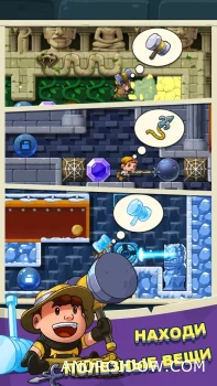 На пути к сокровищам вас подстерегают обвалы, падающие валуны, скрытые ловушки и головоломки. Чтобы преодолеть все препятствия, придётся не просто бегать и прыгать — придётся думать. В вашем арсенале есть Легендарный Молот, способный крушить стены, Морозный Молот для заморозки врагов и Цепкий Крюк, открывающий доступ к труднодоступным участкам карты.