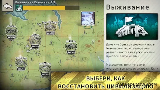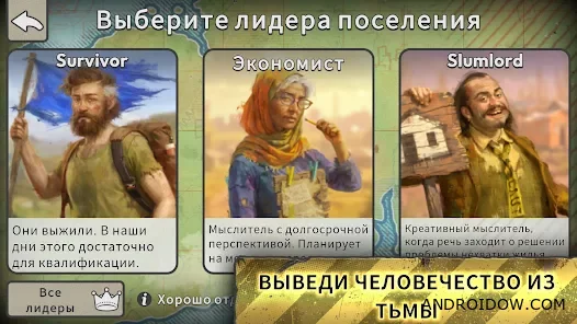 В начале вы выбираете одного из пяти лидеров, каждый со своей философией и уникальными бонусами. Постройте поселение среди развалин, наладьте производство еды, создайте склады и укрепления. За стенами всегда скрывается опасность, поэтому стратегическое планирование и правильное распределение ресурсов — ключ к выживанию.