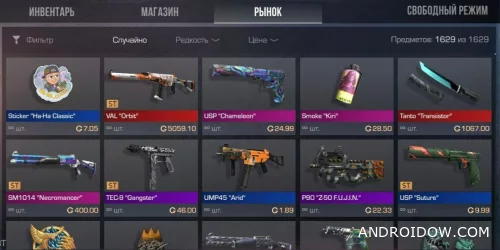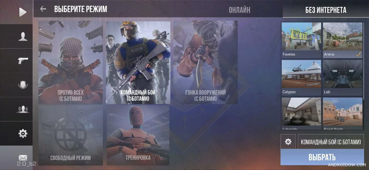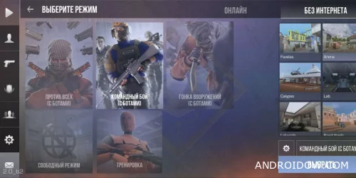 - Игра с ботами (доступны режимы Командный бой, Гонка вооружений, Против всех)