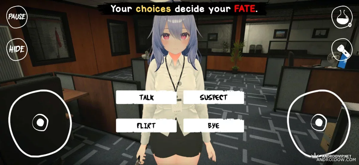 По мере прохождения ты сталкиваешься с разными персонажами, у каждого из которых своя история и поведение. Игра предлагает несколько концовок, благодаря чему каждое прохождение ощущается по-новому. Контраст между аниме-стилистикой и мрачной атмосферой усиливает напряжение и делает происходящее ещё более непредсказуемым.