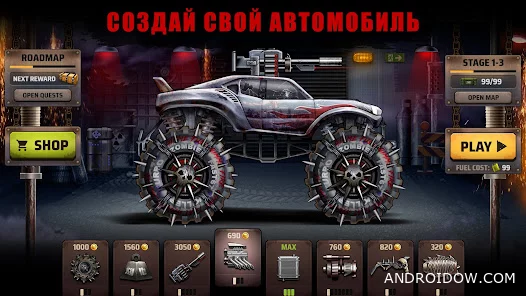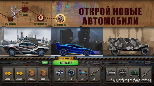 Особое внимание уделено прокачке транспорта. В гараже можно установить оружие, улучшить двигатель и усилить топливную систему, чтобы эффективнее справляться с толпами противников. Постепенно открываются новые машины, каждая из которых обладает своими характеристиками и подходит под разные стили игры.