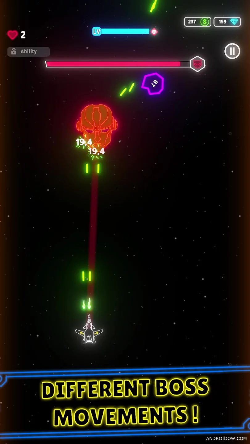 Геймплей построен на скоростных манёврах и постоянной смене темпа. Собирай сферы, прокачивай способности и выстраивай уникальные комбинации из более чем 20 навыков. Каждая ошибка стоит жизни — но именно это делает Neon Wings на Андроид по-настоящему захватывающей. С каждым раундом враги становятся умнее, а боссы — опаснее, заставляя действовать быстрее и точнее.