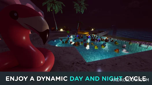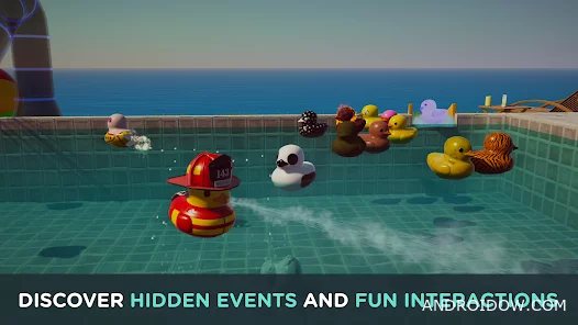 Вместе с вами в бассейне окажутся другие утки — каждая со своим характером, анимацией и привычками. Плавайте, катайтесь с горки, загорайте или просто наблюдайте за сменой дня и ночи. Placid Plastic Duck Simulator на Андроид создан для тех, кто любит расслабляющие игры без спешки и давления.