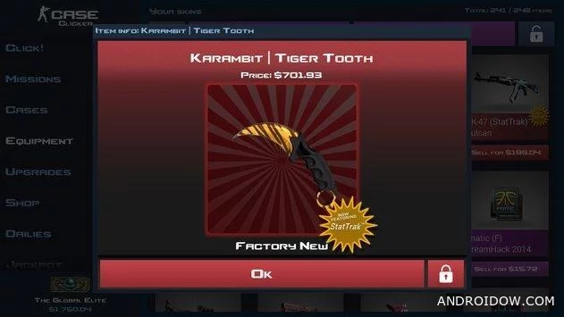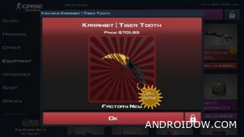 Case Clicker для Android — это увлекательный симулятор открытия кейсов, созданный по мотивам Counter-Strike: Global Offensive. Здесь вы сможете испытать свою удачу и собрать коллекцию редких скинов, полностью воссозданных в стиле оригинальной игры. Несмотря на то, что приложение не связано с настоящей CS:GO, атмосфера и визуальные эффекты полностью передают ощущение кручения настоящего кейса. Похожая по духу игра — CSGO Case Simulator.