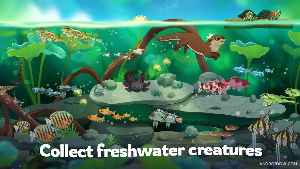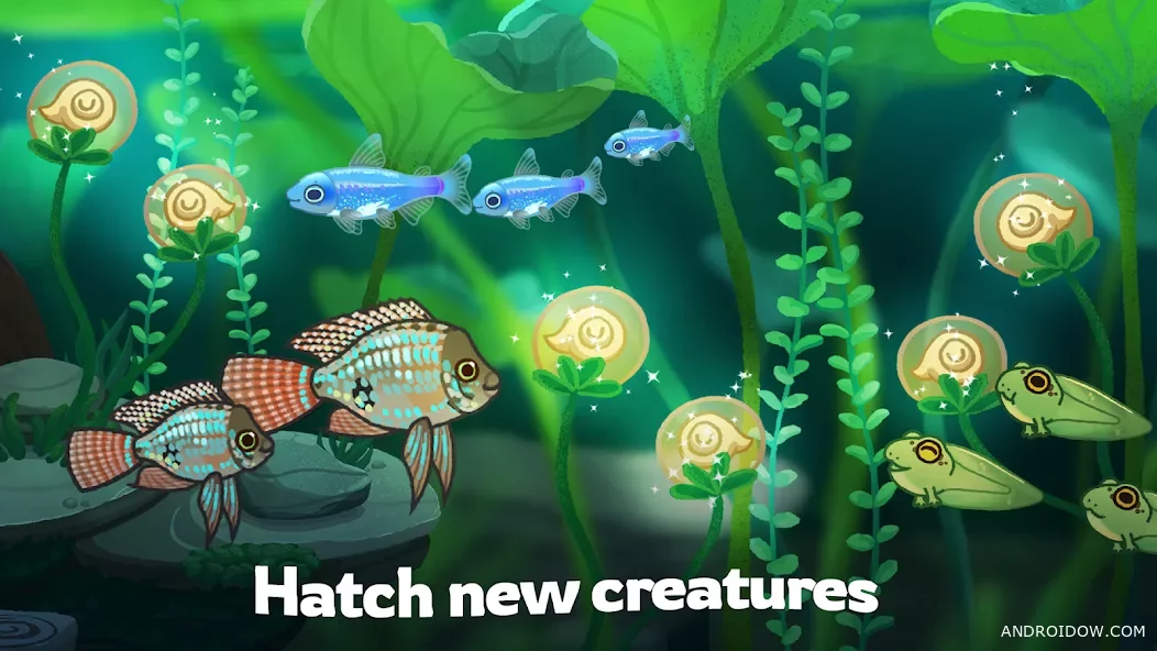 По ходу игры ты не просто наблюдаешь, а реально прокачиваешь свой пруд: открываешь новые виды, украшаешь территорию, собираешь коллекцию в местной «Аквапедии». Плюс периодически проходят ивенты с ограниченными существами и декором — отличный повод зайти ещё раз и не пропустить что-то редкое.