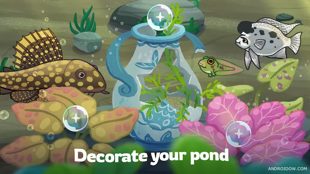 Pondlife – Relaxing Fish Game — это спокойный симулятор пруда, который не напрягает, а наоборот даёт возможность залипнуть и просто кайфануть от процесса. Тут нет спешки, нет стресса — только ты, вода и куча живности, которую нужно выращивать и развивать.