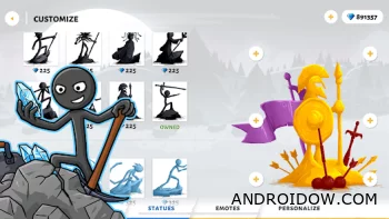 Настройка поля битвы — ещё одна причина моей привязанности к Stick War: Saga. Украшение войск уникальными скинами, пользовательские статуи, блестящее золото и собственные голосовые линии и эмоции делают игру ещё более индивидуальной.