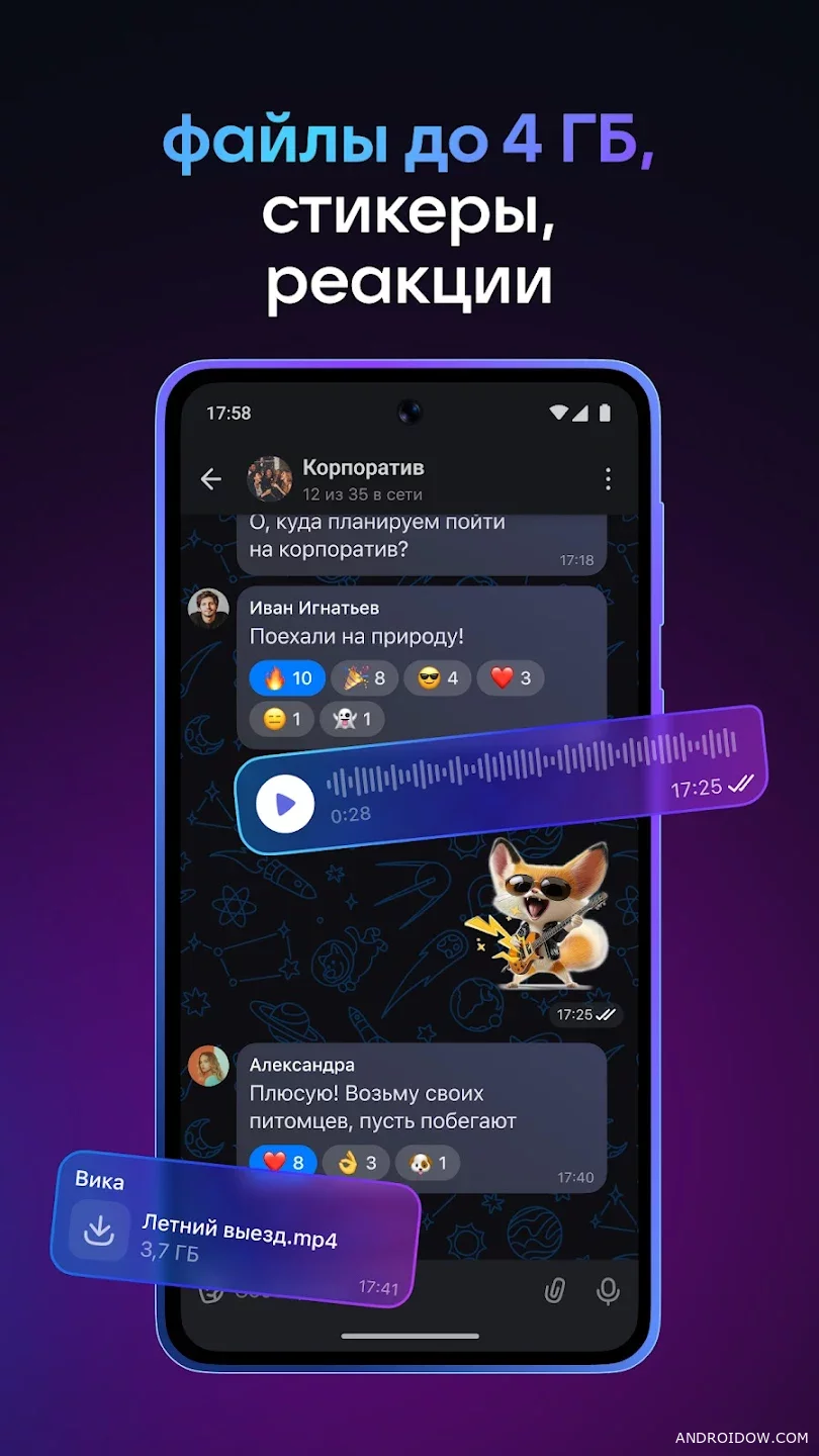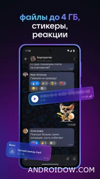 В приложении доступны анимированные стикеры, личные и групповые чаты, реакции на сообщения, голосовые записи и передача файлов без сжатия. Всё это делает MAX отличным инструментом как для личного общения, так и для командной работы.