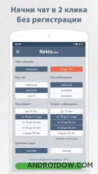 Анонимный чат NektoMe — это приложение для общения, которое полностью оправдывает своё название и предлагает пользователям удобную платформу для поиска собеседников без раскрытия личных данных. Ты можешь общаться с разными людьми, выбирая подходящие критерии и находя тех, с кем действительно интересно вести диалог.